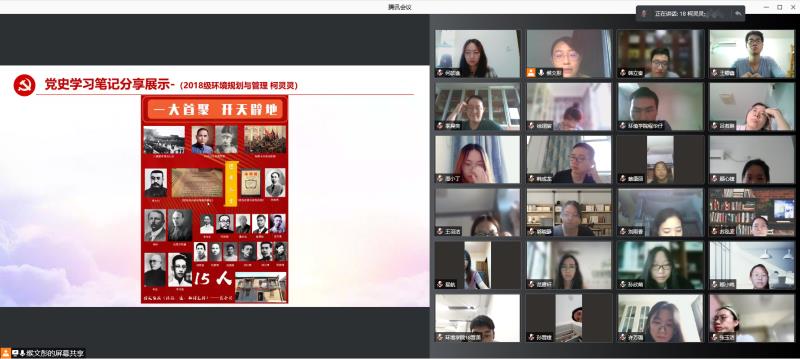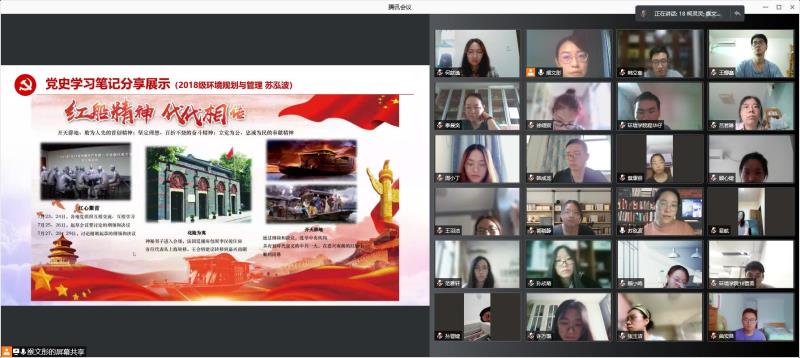 第三个环节,熊涛同学以《铸就百年辉煌 书写千秋伟业》为题,带领支部党员重温习近平总书记在庆祝中国共产党成立100周年上的讲话精神:全面回顾一百年来我们党围绕实现中华民族伟大复兴,团结带领中国人民开辟的伟大道路、创造的伟大事业、取得的伟大成就,庄严宣告我们实现了第一个百年奋斗目标,在中华大地上全面建成了小康社会,深刻总结了伟大建党精神,系统阐述了以史为鉴、开创未来的"九个必须"。随后周炜喆、蔡康丽两位同学分享了学习心得,他们表示作为一名环境青年,要把中华民族伟大复兴和个人理想信念相结合,在党史学习中不断提升政治自觉与思想自觉,坚持以永不懈怠的精神和一往无前的奋斗姿态,乘风破浪、坚毅前行,为全面建设富强民主文明和谐美丽的社会主义现代化强国贡献青春力量!
