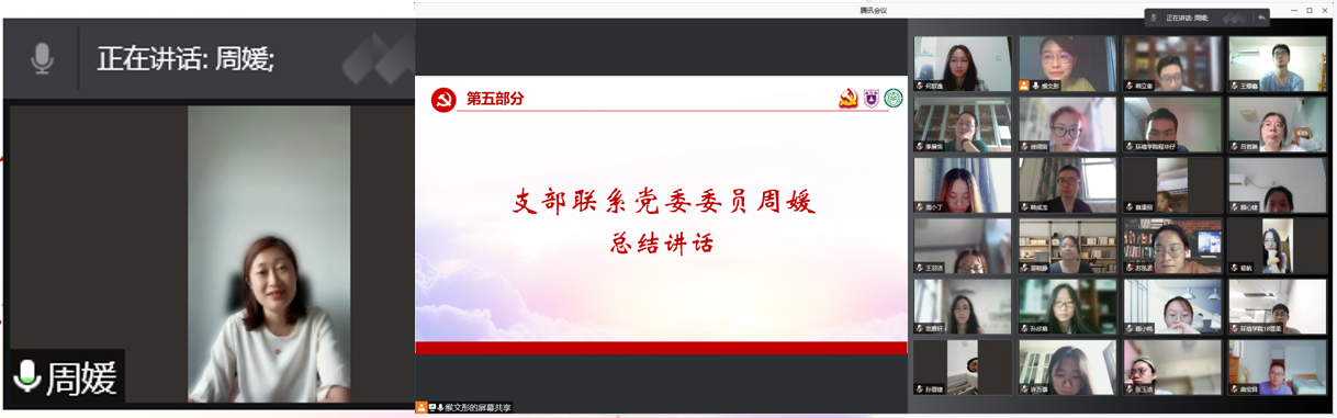 活动最后,周媛作总结讲话。她向同学们转达了学院党委书记刘建萍、院长任洪强的问候,表达了学院领导和老师们对同学们的牵挂,为同学们配合学校和属地疫情防控管理要求的行动点赞。她表示本科生党支部工作扎实、台账清晰,尤其是"星火菁英计划"等创新性活动颇具特色,希望支部继续保持良好的学习传统,深入推进"九个必须",开展常态化党史学习,强化党员服务工作。她希望,每位党员认真学习学习习近平总书记在庆祝中国共产党成立100周年上的讲话精神,进一步增强对内容的了解、加深对内涵的理解,并结合学习任务、学科特点,特别是我国生态文明建设的战略规划,以学促行,为将来投身社会、服务社会、奉献社会打好基础。最后,她希望同学们谨记习近平总书记的教导,争做有志气、骨气、底气的青年人,将个人成长与国家命运紧密结合,成为国家生态文明建设的生力军,为建设美丽中国贡献力量!