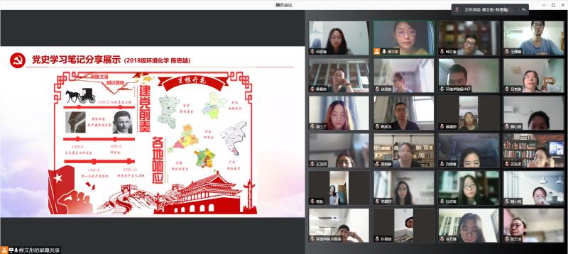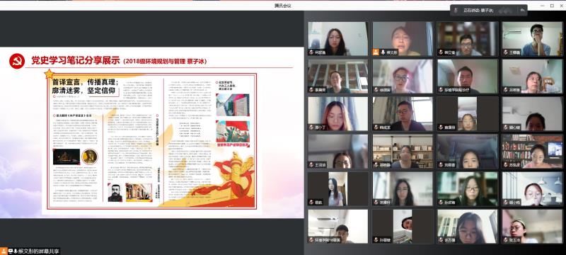 第三个环节,熊涛同学以《铸就百年辉煌 书写千秋伟业》为题,带领支部党员重温习近平总书记在庆祝中国共产党成立100周年上的讲话精神:全面回顾一百年来我们党围绕实现中华民族伟大复兴,团结带领中国人民开辟的伟大道路、创造的伟大事业、取得的伟大成就,庄严宣告我们实现了第一个百年奋斗目标,在中华大地上全面建成了小康社会,深刻总结了伟大建党精神,系统阐述了以史为鉴、开创未来的"九个必须"。随后周炜喆、蔡康丽两位同学分享了学习心得,他们表示作为一名环境青年,要把中华民族伟大复兴和个人理想信念相结合,在党史学习中不断提升政治自觉与思想自觉,坚持以永不懈怠的精神和一往无前的奋斗姿态,乘风破浪、坚毅前行,为全面建设富强民主文明和谐美丽的社会主义现代化强国贡献青春力量!